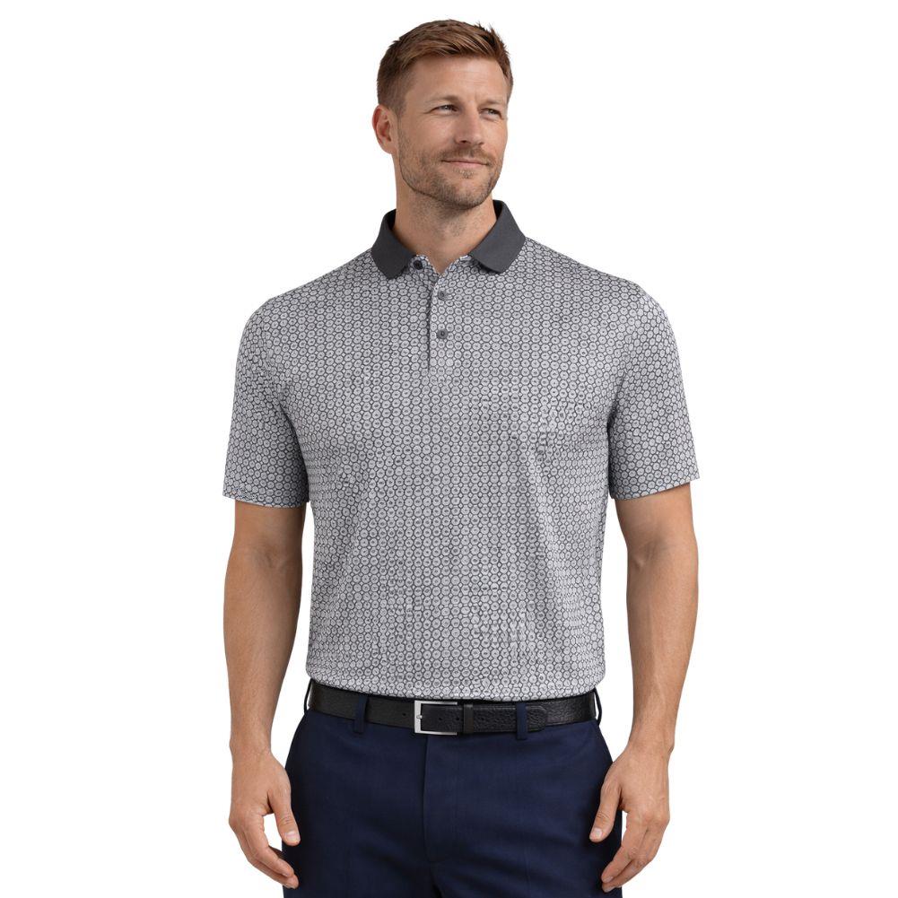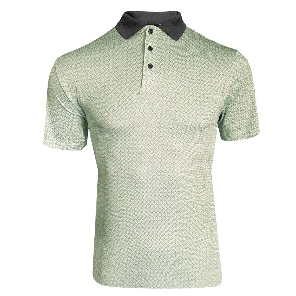 Elevate your golf style with this Men’s Polo Shirt featuring a distinctive all-over chain print. Designed with 4-way stretch jersey knit fabric, it offers breathable comfort, UV protection, and moisture-wicking finishes. The ribbed contrast collar adds a refined touch, perfect for on and off the course.