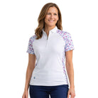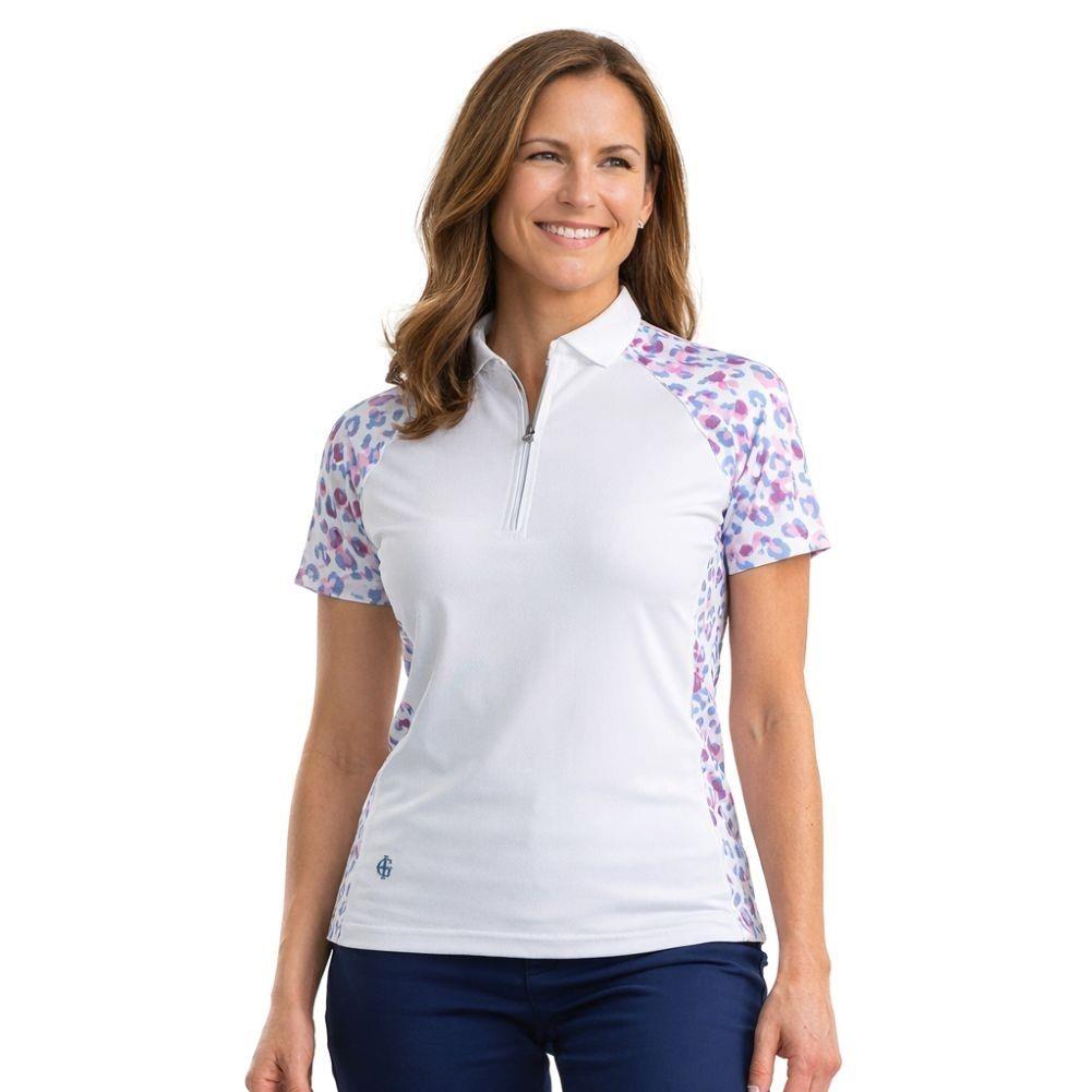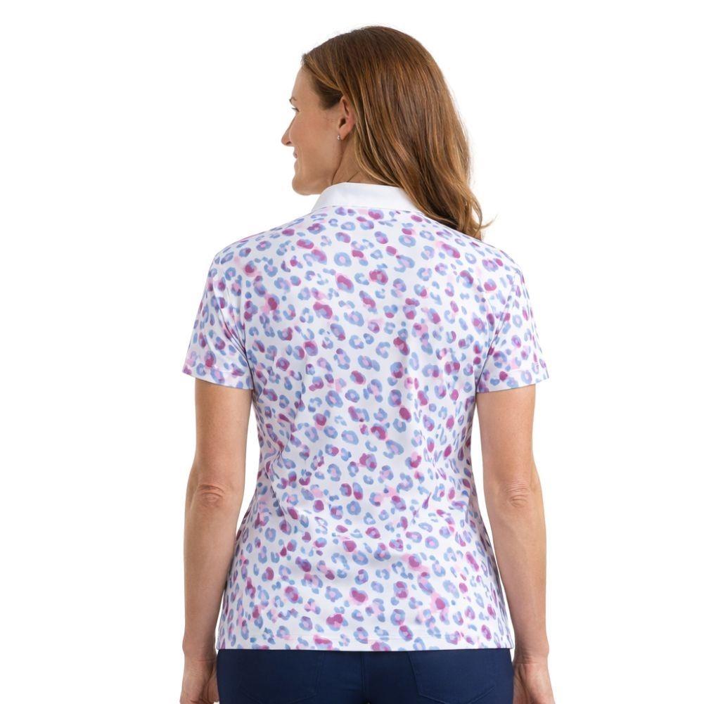 Make a statement on the course with this Ladies' Ribbed Collar Polo featuring a bold leopard print on the sleeves and back. Crafted from honeycomb jacquard stretch fabric, it offers breathable comfort, UV protection, and moisture-wicking finishes. The ribbed collar and sleek jetted zip detail add a modern and stylish touch to this standout piece.