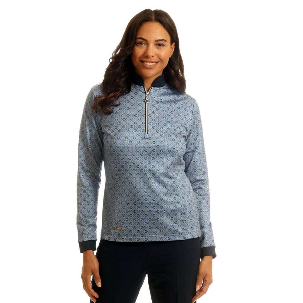 Add a touch of style to your golf wardrobe with the Island Green IGLTL2381 Ladies ¼ Zip Top Layer. Crafted from high-stretch fabric with a striking all-over hexagon tile print, it features a brushed inner for warmth, flattering body seams, and a stylish contrast collar and cuffs. Finished with a shaped collar, branded zip puller, and metal logo badge.